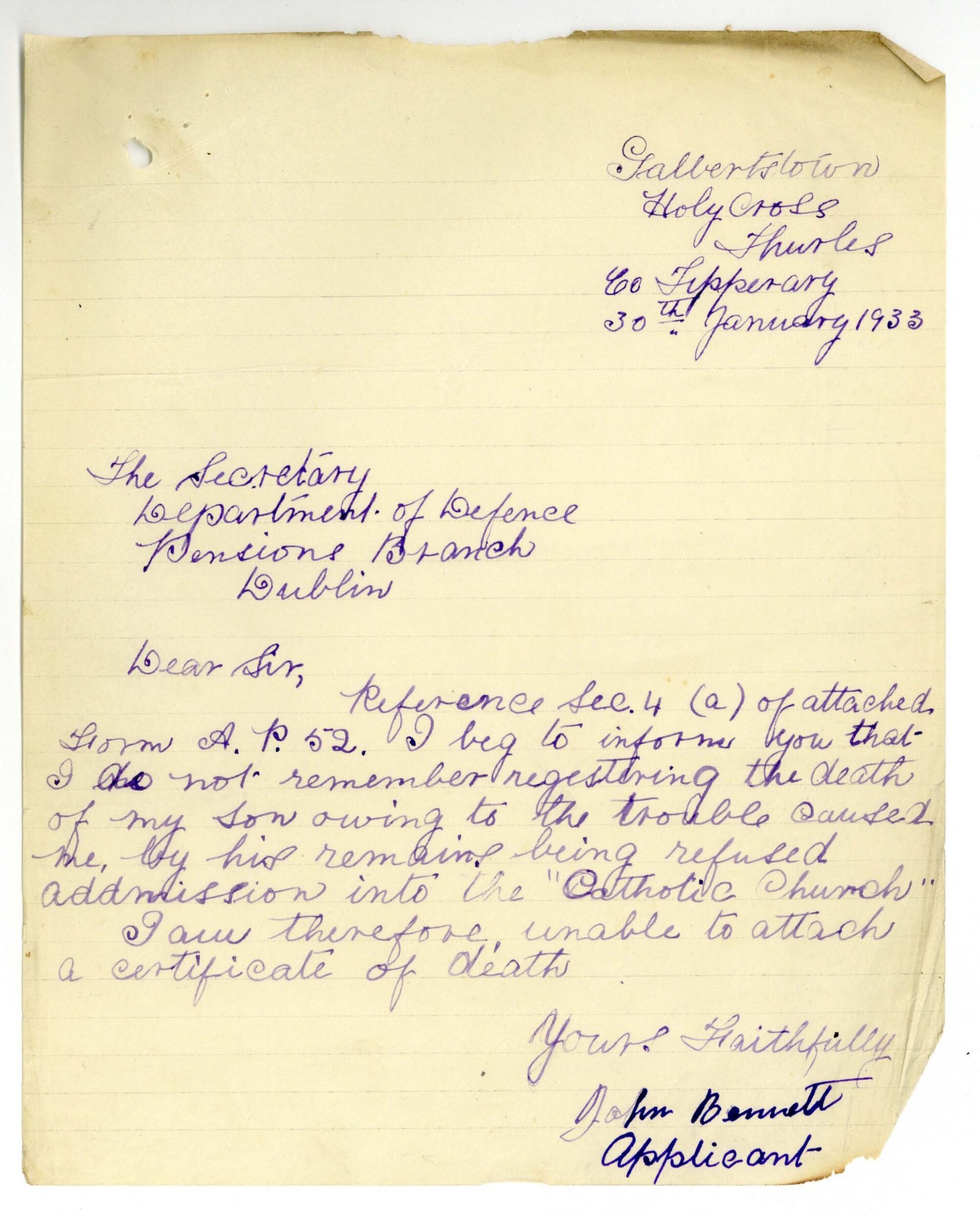 John Bennett informed the Department of Defence that he had been unable to obtain a death certificate (a death cert required by Department as proof death occurred) as his son’s remains were “…refused admission into the Catholic Church.” John Bennett was employed as a farm labourer and was in receipt of 9 shillings per week in 1923. He also had use of a house but no land to work. Following Patrick’s death, John was forced to give up his employment as he was a widower with ten children ranging in ages between 18 months and 21 years. A knock-on effect of him leaving his employment was the loss of the family home. The file also reveals that the family’s circumstances changed drastically following the death of Patrick. The eldest daughters, Mary and Rose, who in 1923 were acting as ‘housekeepers’ to the younger children, left for England to find employment. As a result John Bennett was required to place three of his youngest children in Cashel Industrial School where two of them died. Furthermore by 1934 none of Mr Bennett’s children were in a position to assist him financially. Indeed, he was required to supply his married daughter Nan with vegetables and free milk. One can see why the officer’s assessment of John Bennett rings true: “owing to hardships endured since and subsequent bereavements he has aged considerably with consequent impairment of his health.”