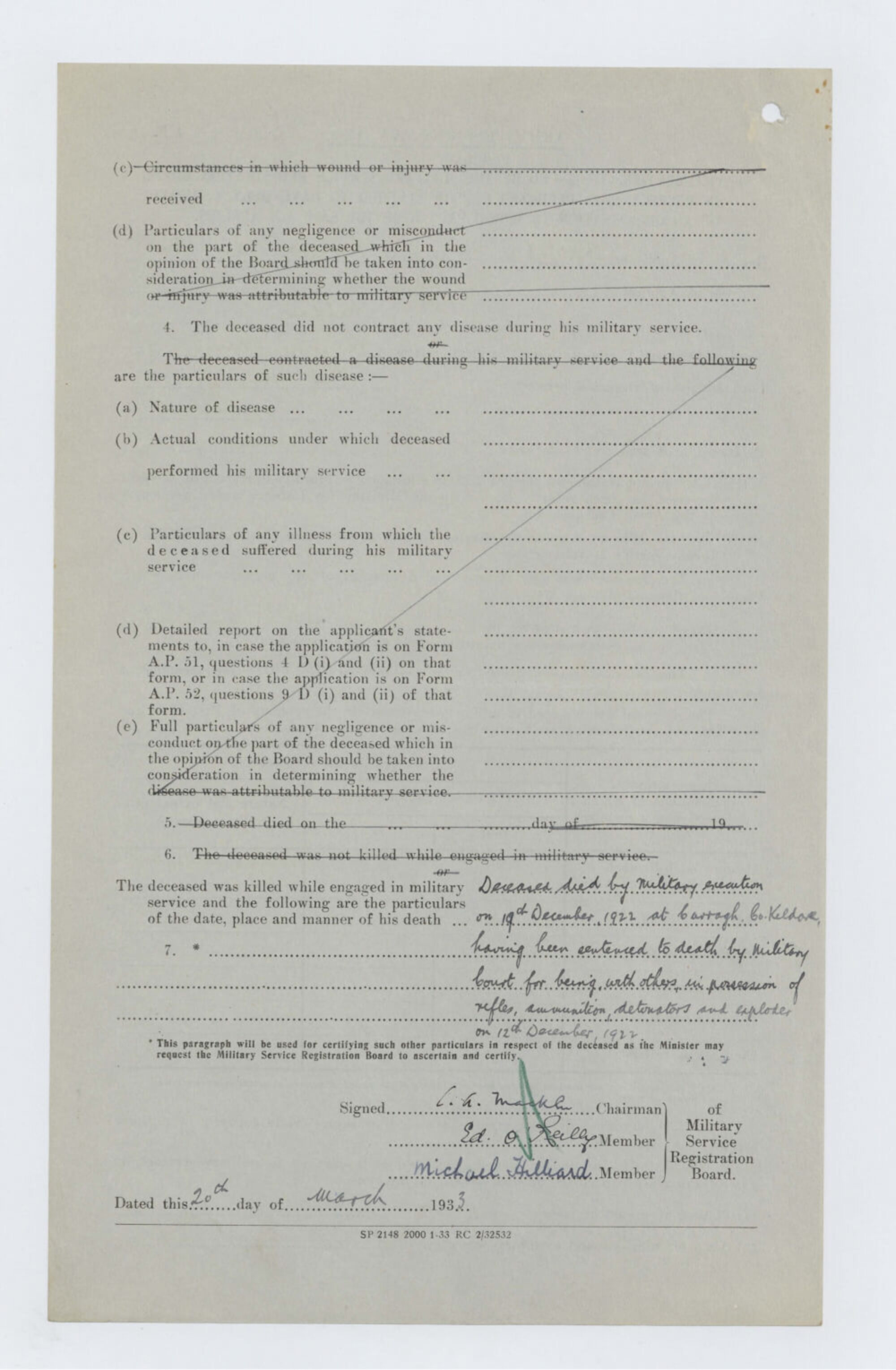 The report from the Army Pensions Board investigation officer notes that while Jane did not have a private income at the time of Patrick’s death her husband was employed on Tully stud farm earning £1 and 18 shillings per week. Two other sons, Thomas and Michael, were employed on the railway each earning £1 and 15 shillings per week. Her daughter, Jane Mary, was employed by the Christian Brothers. Added to this Patrick’s income and the overall income of the family was estimated to be £8.15.0 per week.